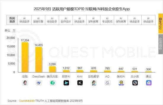 QuestMobile《2025年9月AI原生App榜单》显示,豆包以1.72亿月活稳居第一,DeepSeek以1.45亿月活位列第二——二者合计用户规模接近3.2亿人,几乎相当于中国网民的三分之一。